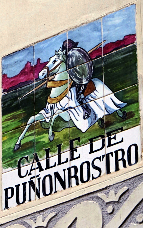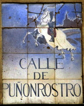Rótulo de la calle Puñonrostro en el centro de Madrid. Más bien una travesía corta, estrecha y lóbrega, que se conecta con la calle de Segovia mediante la Calle del Cordón, toda una alegoría. En ella vivió Juan Árias Dávila, primer conde de Puñonrostro