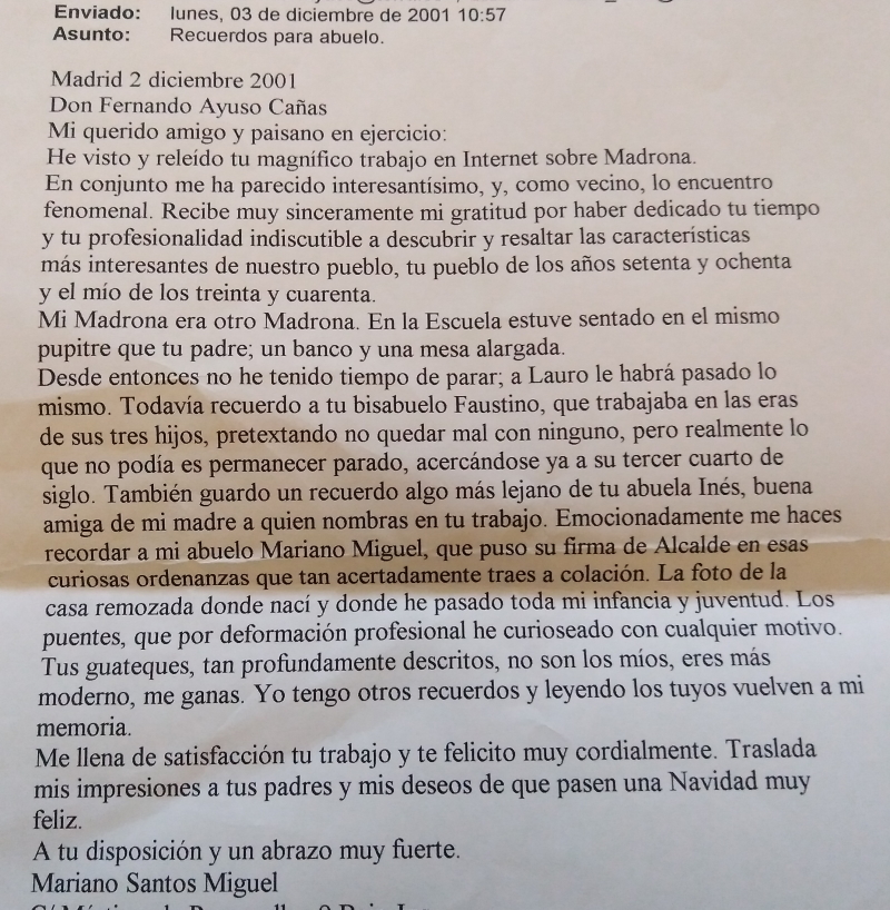 Recibí este correo de D. Mariano Santos a los ocho meses de abrir ___Cuaderno Ð Madrona__ y es su hallazgo lo que ha motivado este escrito.