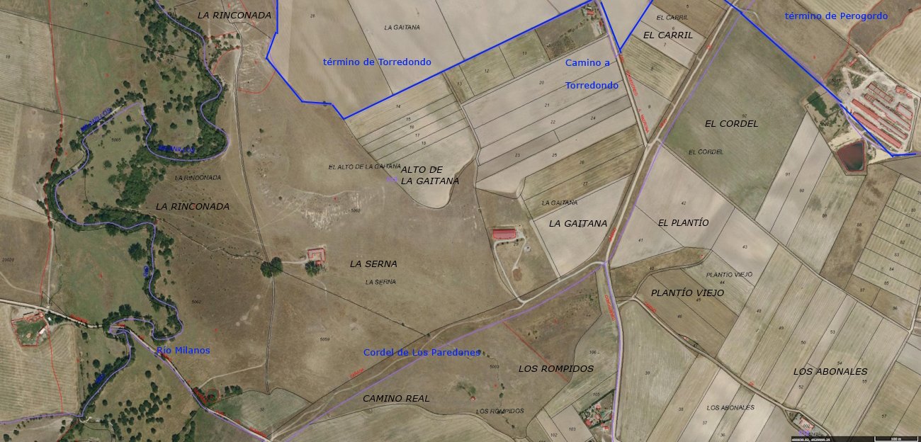 Linda según se indica: al Norte, Camino Real de Ávila, El Carril y Surco Largo, de Perogordo; Sur, Plantío Viejo; Este, Las Bragas; y Oeste La Gaitana.