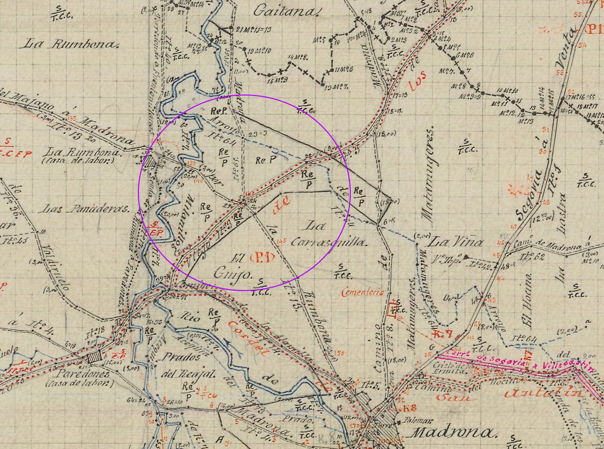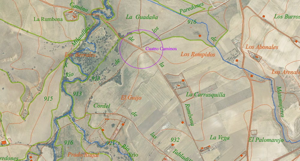 El propósito de poner tanto mapa es el de ver cómo en toda la infografía y planimetría estatal que viene de Torredondo, que es la Calzada Romana que tenemos pendiente de investigar, llega en diagonal a los Cuatro Caminos en línea recta. En actualidad se vallado toda la finca, con lo que se interrumpe el paso natural de este camino.