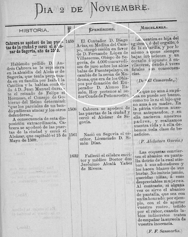 Diego Árias Dávila obtuvo, a mediados del S. XV, múltiples territorios en varios términos cercanos a Segovia, sobre todo en Madrona.