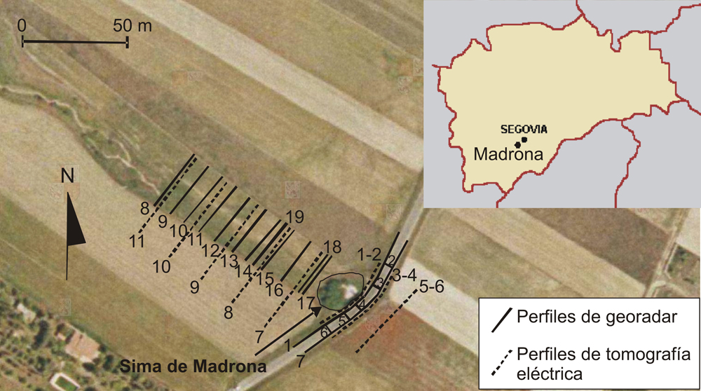 Respecto al origen de esta investigación, surge a partir de una conversación con un amigo y compañero de profesión Andrés Díez Herrero. Es un apasionado geólogo segoviano que trabaja en el Instituto Geológico y Minero de España (IGME), en su sede de Madrid, y que ha escrito algunos libros científicos y de divulgación sobre geología y geomorfología de la provincia de Segovia. Nos comentó que un grupo de espeleología entró en la galería karstica para averiguar su longitud y desarrollo. Nos pareció interesante comprobar estos datos, así como su posible desarrollo hacia el SE, bajo la carretera, con Georradar y Tomografía Eléctrica.