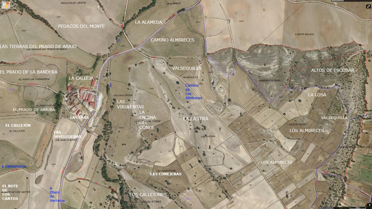 Linda con los parajes que se indican: Norte, Camino Almireces; Sur, Encina del Conde, Los Almireces; Este, Dehesa Escobar; y Oeste, camino Almireces (camino).