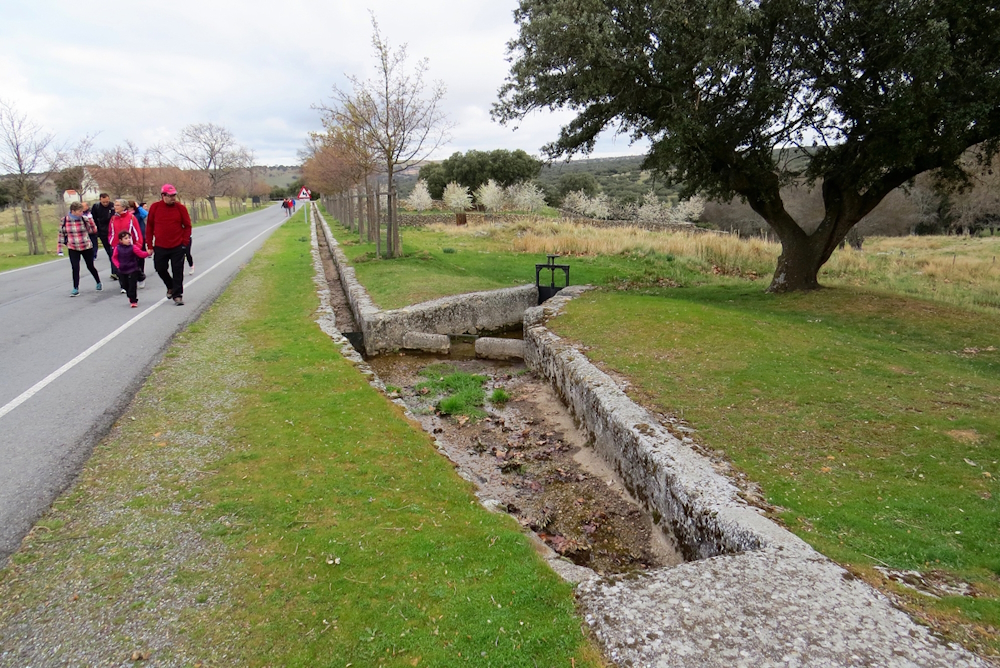 Aquí tenemos a la pequeña Irene, siempre de la mano de su padre y atenta a cualquier novedad, como este sistema de reparto de riego en piedra de granito.