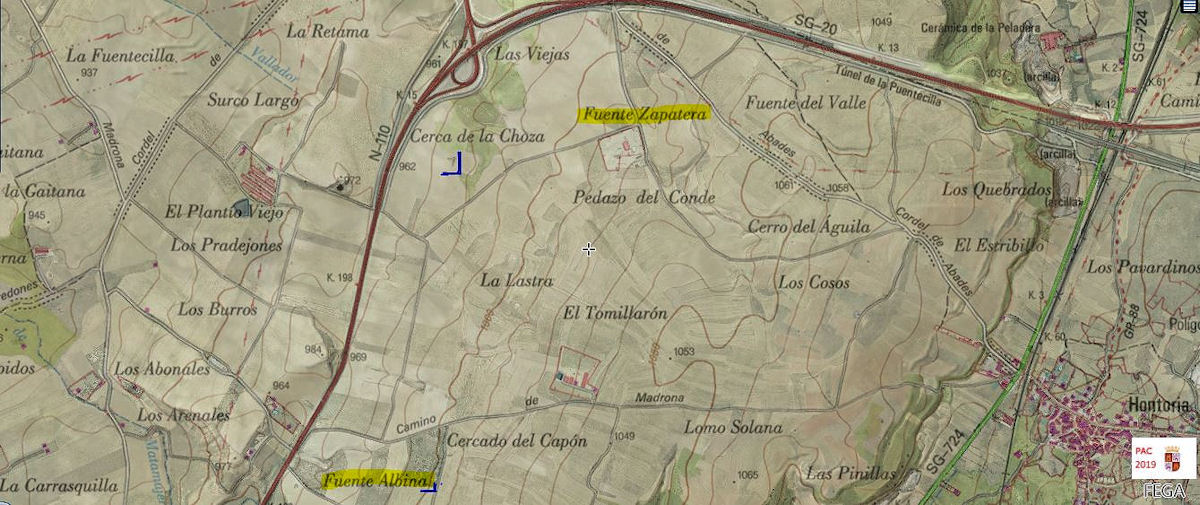 En esta imagen, obtenida del SIGPAC, vemos los topónimos y la situación de las fuentes.