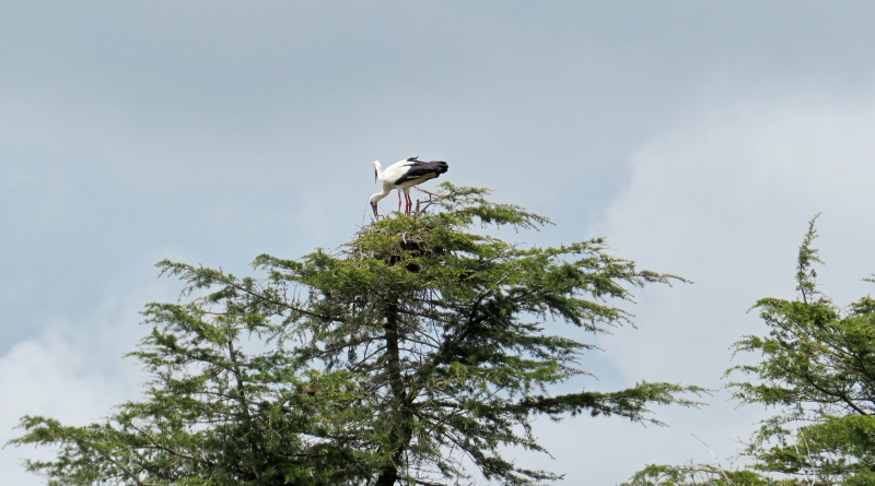 Dos cigüeñas atienden su nido en lo más alto de un cedro de una finca particular en el paraje Rincón de los Marranos.