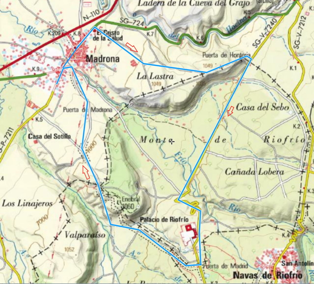 1.- Se inicia desde la ermita del Santo Cristo de la Salud, y se asciende por el Camino del Calvario hasta la misma pared del Real Bosque de Riofrío. Vistas y horizontes.
