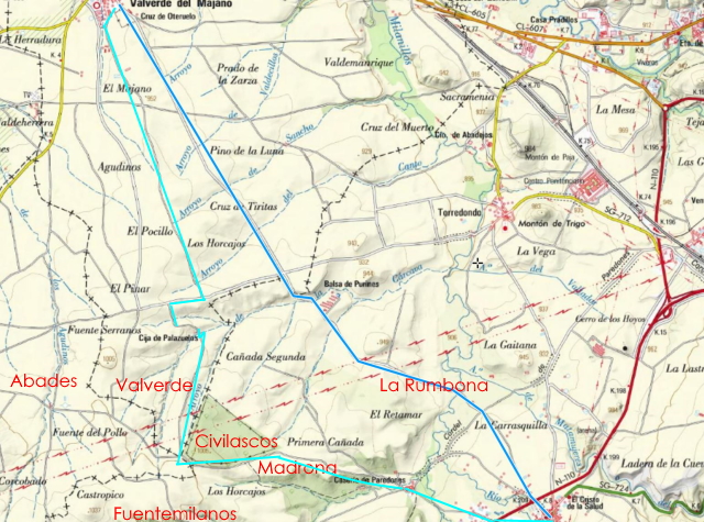 En azul más claro, alternativa de regreso por Civilascos y Paredones
