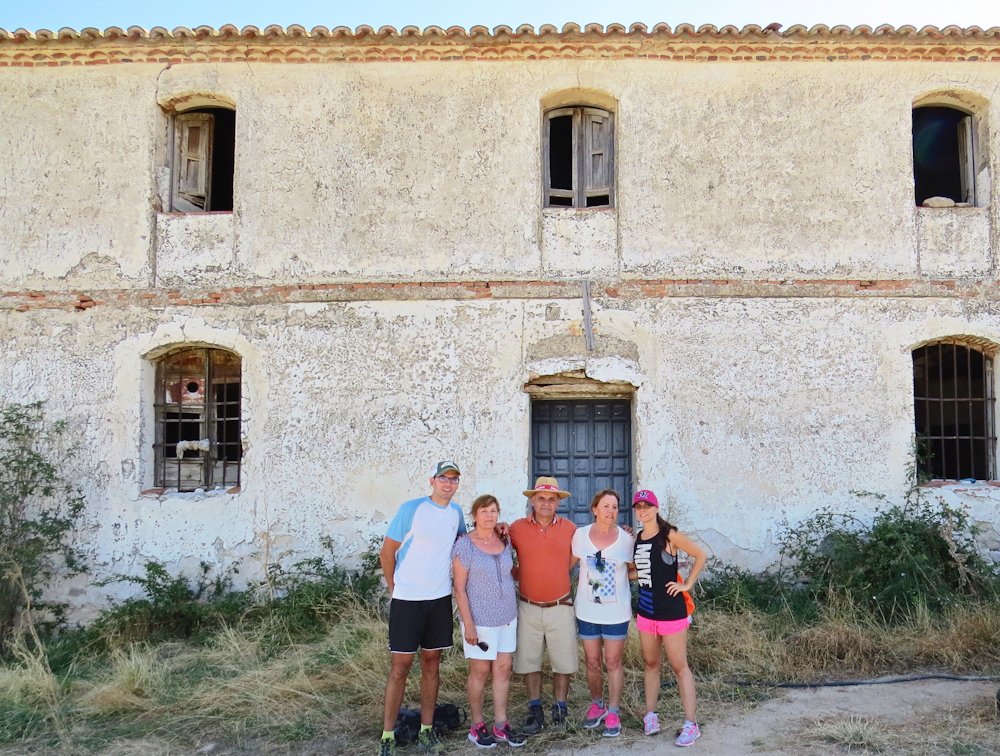 En esta casa nacieron Rosa, Carlos y Puri, (los tres del centro) hijos de Germán Bernardo y Honesta Fuentes, familias de colonos de Escobar. A los extremos, Fernando Otero Bernardo (hijo de Rosa) y Soraya Bernardo García (hija de Carlos), de la generación siguiente. |