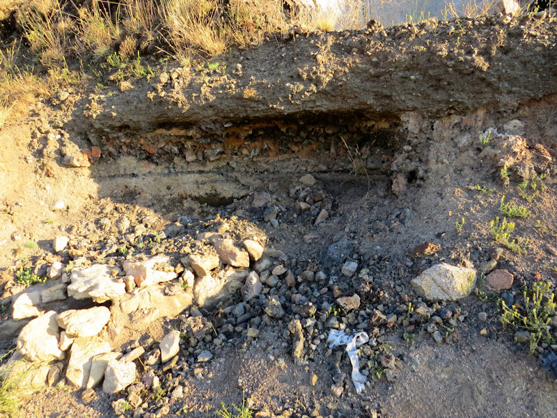 Atarjea o canal de desague de la zona de procesamiento del mineral. En esta zona se encuentran minerales de hierro, wolframio y cobre. Sin embargo, la mayor actividad metalúrgica se desarrolló con el cobre. Entre los sedimentos se distiinguen muchas piezas de distintas escorias reutilizadas como relleno. |