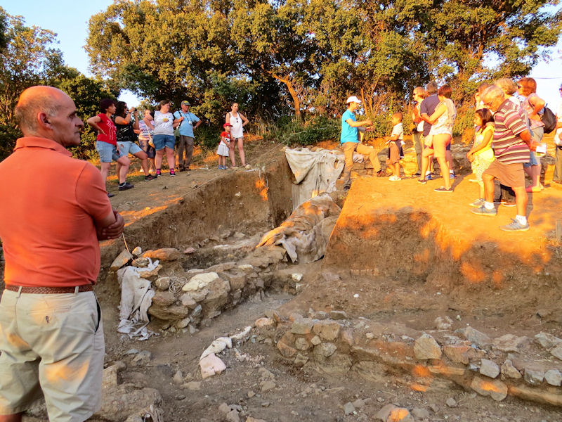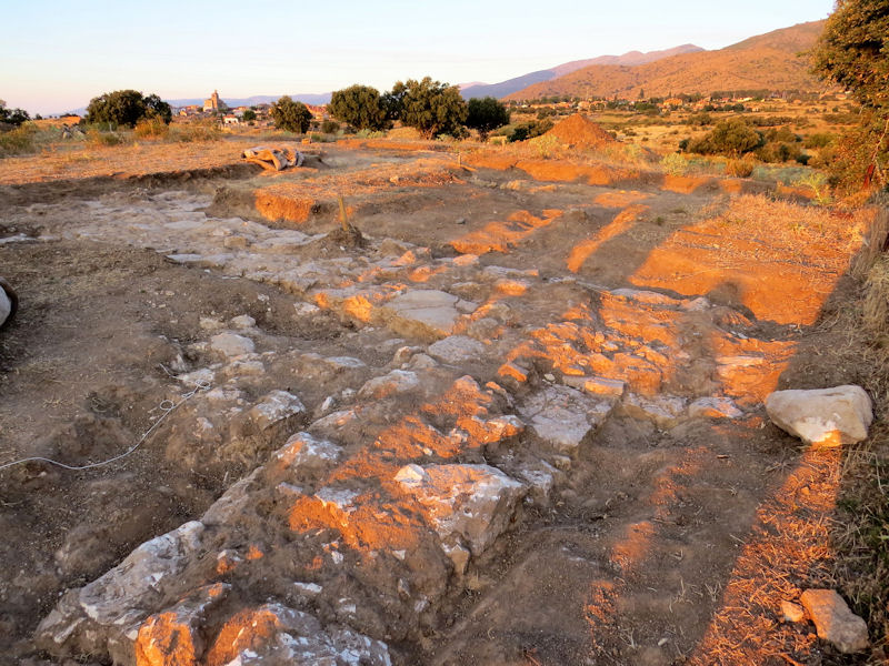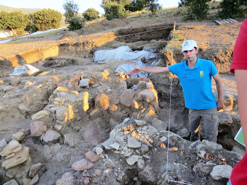 Estamos al final de la visita, ante varias capas de vestigios de asentamientos sobre los que se está trabajando. Se trata de la población colateral de la industria metalúrgica. Del originario pueblo de Otero de Herreros. El de ahora no debería tener ese nombre porque sus pobladores ya se dedican a otras cosas desde el año 600 d. C. Hay mucho por averiguar porque esta zona estuvo en continuo cambio mientras duró la actividad minera y las distintas fases constructivas se cruzan, interponen y enredan, lo cual complica, y multiplica, la tarea arqueológica. El sol se pone por el Oeste, y por el Este lo releva la luna este 26 de julio.