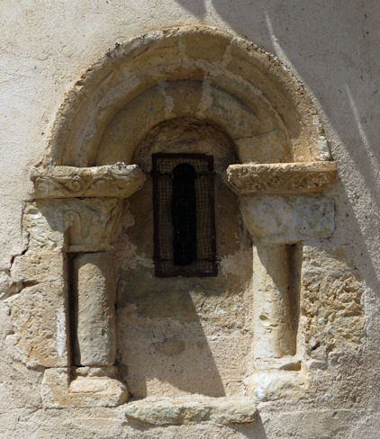 Ventana de uno de sus ábsides, en la que se aprecia ese románico primigenio, casi prerrománico.
