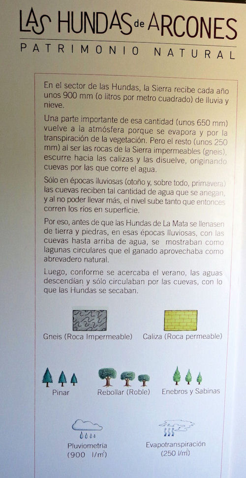 Tiene Arcones repartidos por su término varios grupos de hundas, concepto con el que designan aquí a las dolinas. Algo similar a nuestra Sima. Debido a que en cierta época se destruyeron varias de ellas, ahora intentan recuperarlas y darlas el valor que durante milenios han tenido por los beneficios que sus aguas aportaron a los rebaños de ganados y a los mismos vecinos.Estas lagunas, formadas en depresiones sobre roca caliza, se encuentran a menudo entre, o al lado de, frondosos bosques de sabinas y robles y la alcaldesa, que nos ha guiado hasta ellas nos relata in situ las múltiples sendas y rutas que tienen señalizadas para la actividad del senderismo.