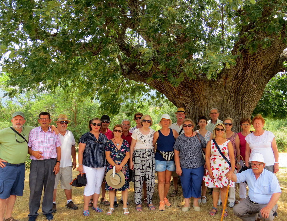 Bajo este roble centenario, en un bosque de múltiples especies, posamos con la alcadesa, Dª Laureana Martín, en centro, con sombrero blanco.
