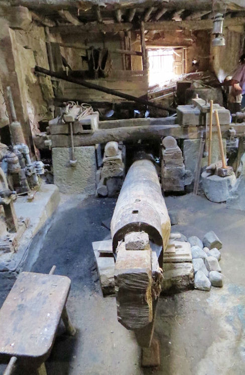 Este el el artilugio que da nombre a esta actividad: el martinete, que en realidd es un martillo pilón que mete miedo. Era movido a su vez por otro ingenio que partía de la gran rueda de la imagen de arriba.