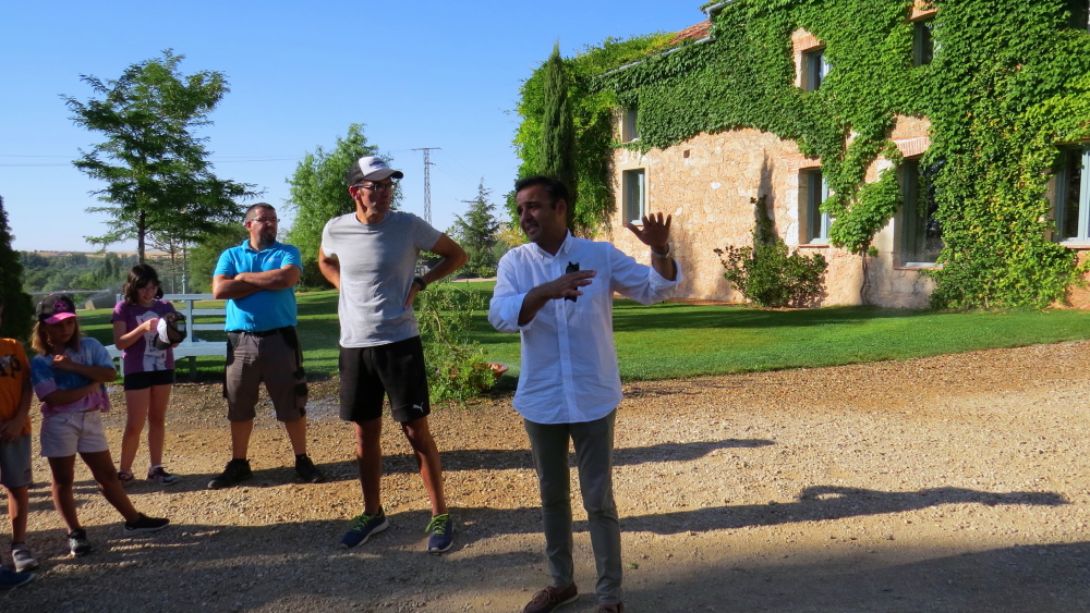 Se inició la visita con una breve exposición por parte de Nando (Fernando Otero Bernardo), miembro de la Junta Directiva, sobre los orígenes del caserío (aparece ya en los documentos que relatan hechos del año 1450, época en la que Enrique IV de Castilla tenía su corte en Segovia, con su valido y poderoso Diego Árias Dávila, Digarias el Viejo, propietario de enormes territorios entre los que se incluía Madrona y sus todos sus términos, anejos y casas de labor) y su actividad hasta que en el 2009 fue adquirido por la familia originaria de Fuentemilanos, Reques Sánchez.